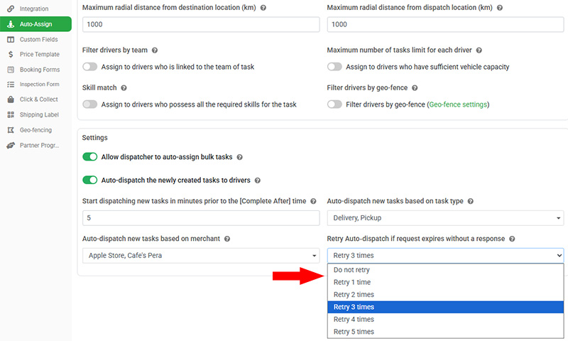 We’ve enhanced the automated task assignment module with a new Auto-dispatch Retry feature to help ensure new tasks are assigned without delays. When auto-dispatch is unable to find an available driver that meets your criteria, or when no team member accepts the task within the initial expiry period, the system will now automatically retry the auto-dispatch process. After each expiry, the task can be re-sent to available drivers, giving your team multiple opportunities to accept the job until a driver becomes available or accepts the assignment.