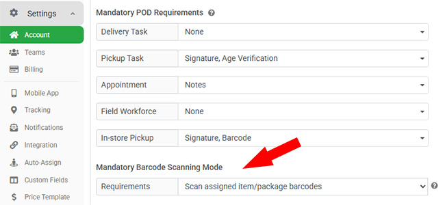 To enforce scanning, go to Settings → Account page and set the mandatory barcode scanning mode to “Scan assigned item/package barcodes”. This ensures every package is scanned and accounted when completing a task on the driver app.